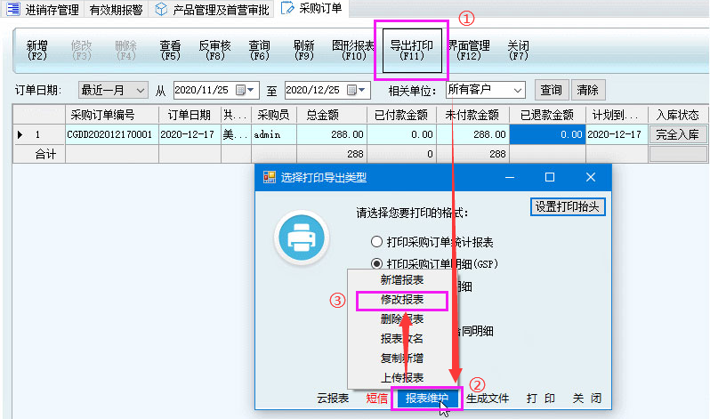 修改方式:導出打印-報表維護-報表改名-加上“明細”-確定