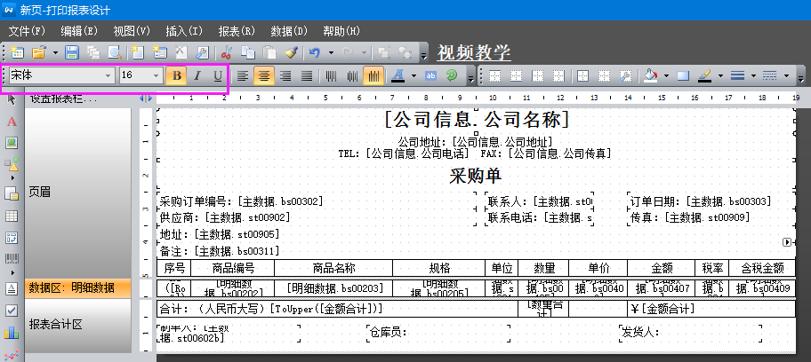 打開報表修改頁面后,點擊文本框,然后修改在左上角的字體/文字大小/是否加粗。