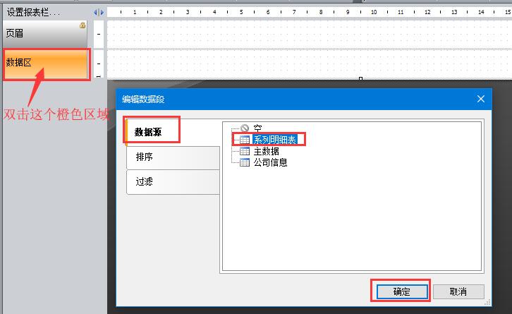 5、雙擊數(shù)據(jù)區(qū)(橙色區(qū)域),在彈出的窗口中,點(diǎn)擊數(shù)據(jù)源,再點(diǎn)擊系列明細(xì)表,點(diǎn)擊確定。