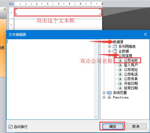 10、雙擊文本框,在彈出的窗口中雙擊公司名稱(chēng),然后點(diǎn)擊確定