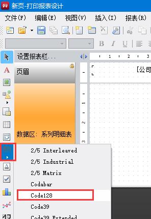 11、點(diǎn)擊左側(cè)工具欄的條碼工具,點(diǎn)擊Code128,然后把條碼放在合適的位置