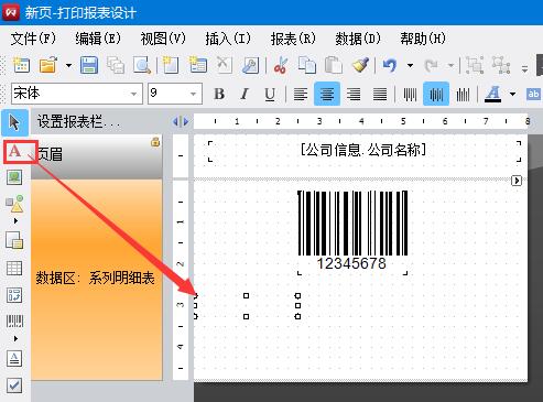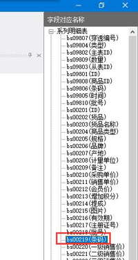 12、點(diǎn)擊條碼右上角的黑色三角形,參照右側(cè)的字段對(duì)應(yīng)名稱(chēng),可見(jiàn)條碼的字段為bs00219。