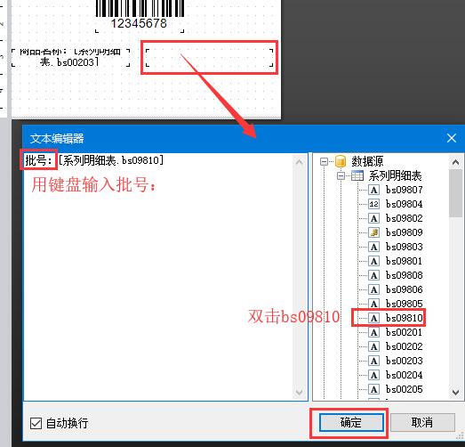 15、按照第14步的方法,添加批號(hào)、生產(chǎn)日期等內(nèi)容,例如在彈出的窗口中輸入“批號(hào):”,然后雙擊bs09810(參照右側(cè)的字段對(duì)應(yīng)名稱(chēng),可見(jiàn)批號(hào)的字段為bs09810)