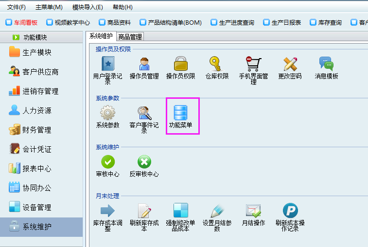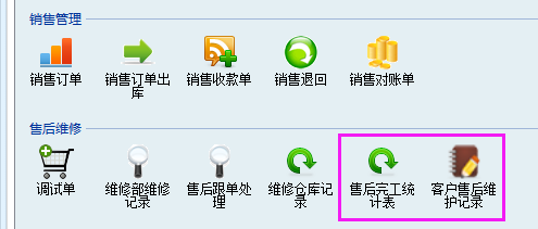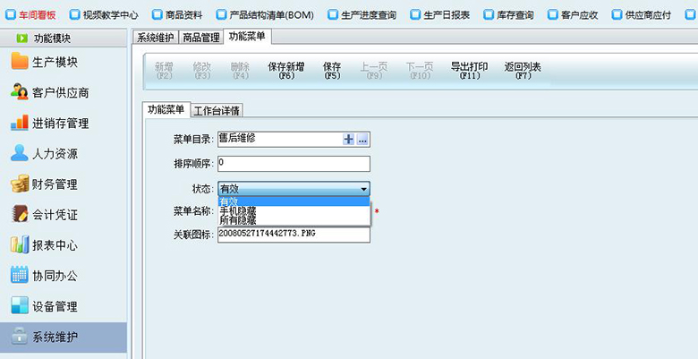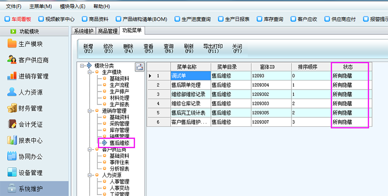 在系統維護——功能菜單——進銷存管理——售后維修,把狀態(tài)(所有隱藏)全部改為有效。