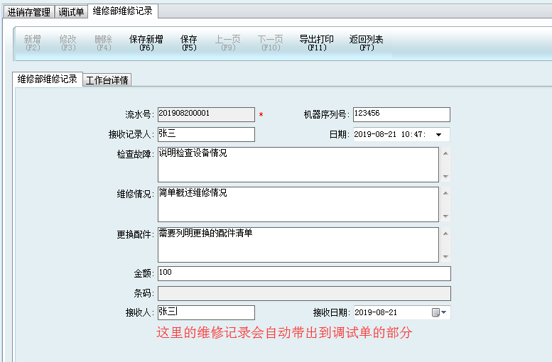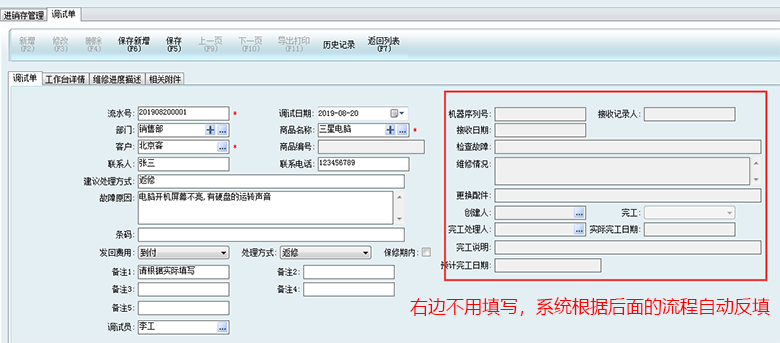 2、維修部維修記錄:維修記錄情況會自動反填到調試單上