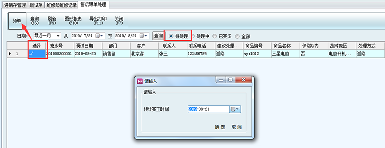 3、售后跟單處理:在待處理中的維修單中,維修人員需要選擇相關維修單,點擊“領單”操作進行維修,設定預計完工時間,并且系統自動消除待處理的記錄。