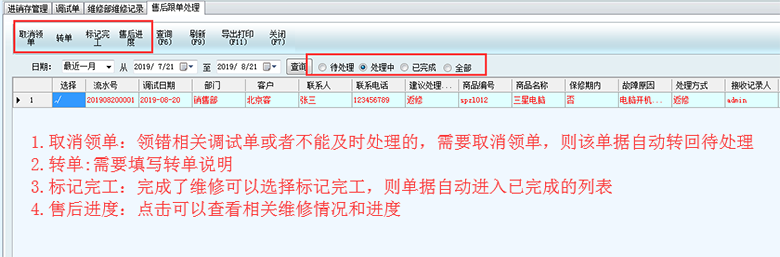 a.取消領單:選擇單據點擊取消領單,單據自動返回到維修單待處理列表