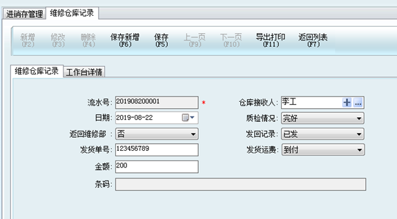 4、維修倉庫記錄:流水號自動根據前面的流程帶出,不能修改。