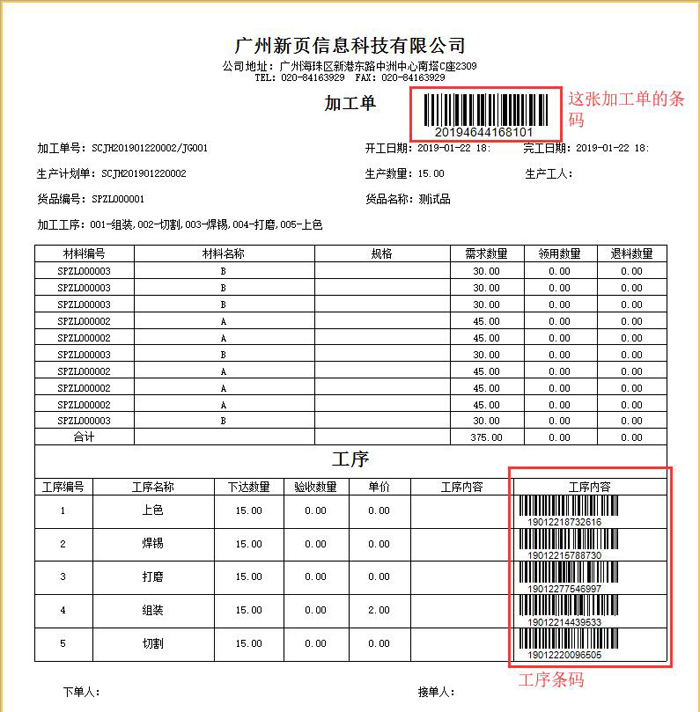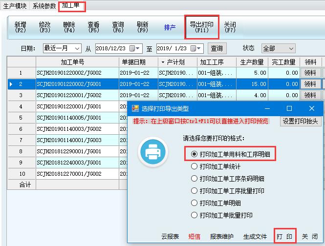 1)首先把該加工單打印出來,點(diǎn)擊菜單欄的導(dǎo)出打印,選擇報(bào)表打印加工單用料和工序明細(xì),點(diǎn)擊打印,可見打印出來的報(bào)表如下圖(注意看加工單條碼和工序條碼)