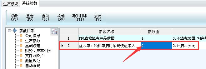 2)同樣地,在系統(tǒng)維護(hù)-系統(tǒng)參數(shù),找到參數(shù)“驗(yàn)收單、領(lǐng)料單啟用條碼快速錄用”,把參數(shù)值改為0,退出軟件,重新登錄。