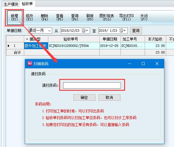 3)打開生產(chǎn)模塊-驗(yàn)收單,點(diǎn)擊新增,彈出掃描條碼的窗口,把鼠標(biāo)的光標(biāo)放在下圖方框中,使用掃描槍掃加工單條碼或者工序條碼,可以快速驗(yàn)收