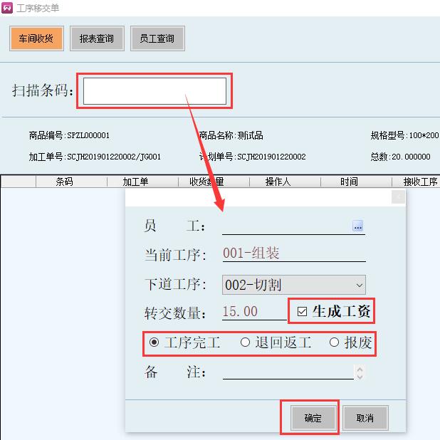 2)打開生產(chǎn)模塊-工序移交單,鼠標(biāo)光標(biāo)放在下圖方框中,用掃描槍掃描工序條碼,則會(huì)彈出如下窗口,信息無誤后,點(diǎn)擊確定,就完成了一個(gè)工序的移交。
