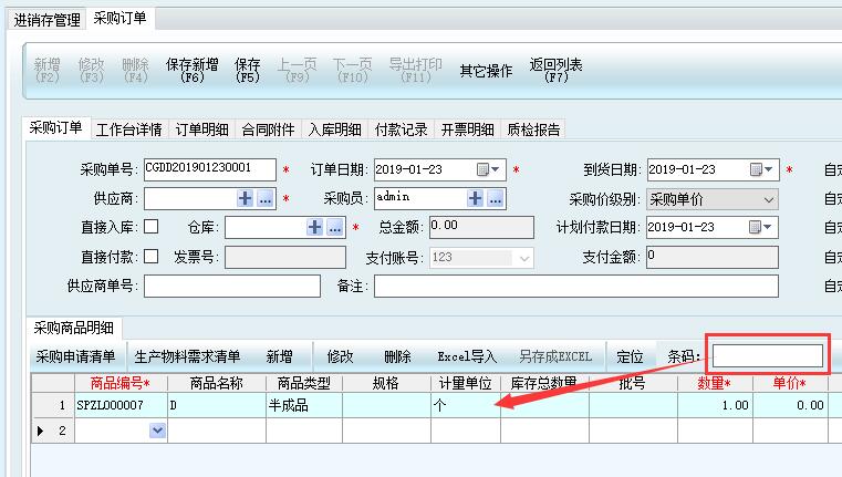 3)打開進(jìn)銷存管理-采購訂單,點(diǎn)擊新增,如下圖,鼠標(biāo)點(diǎn)擊條碼的方框,然后用掃描槍掃描產(chǎn)品條碼,則會(huì)帶出商品信息