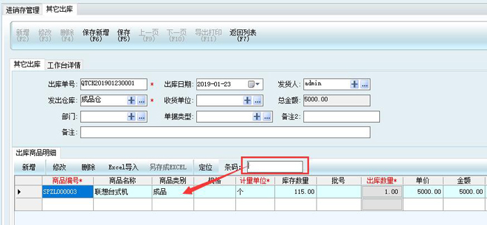3)然后在做其他出庫單時(shí),可以使用掃描槍進(jìn)行出庫,鼠標(biāo)點(diǎn)擊如下圖條碼方框,用掃描槍掃描唯一條碼即可。