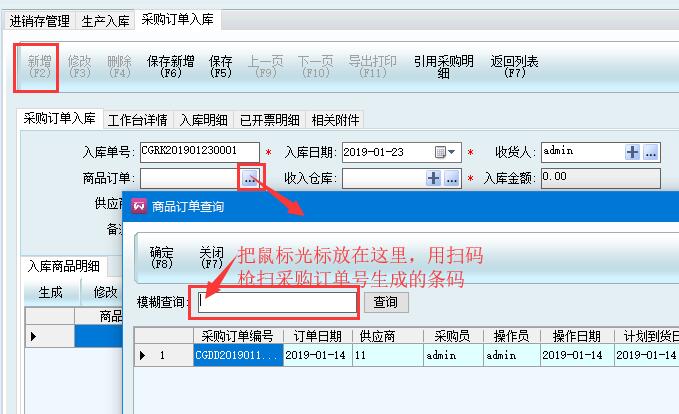 2)例如,采購入庫,打開采購訂單入庫,點(diǎn)擊新增,點(diǎn)擊商品訂單的…符號(hào),在彈出的窗口中,鼠標(biāo)點(diǎn)擊模糊查詢的方框,然后用掃描槍掃描采購訂單號(hào)條碼,即可快速選擇采購訂單進(jìn)行入庫。(銷售訂單出庫操作雷同)