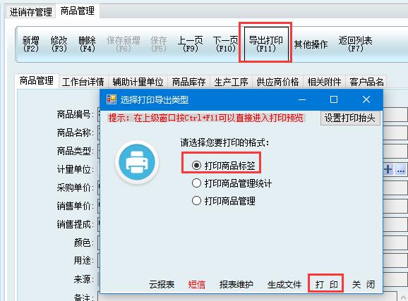 2)然后打印商品的條碼出來,菜單欄點(diǎn)擊導(dǎo)出打印,選擇打印商品標(biāo)簽,打擊打印,如下圖打印出產(chǎn)品標(biāo)簽