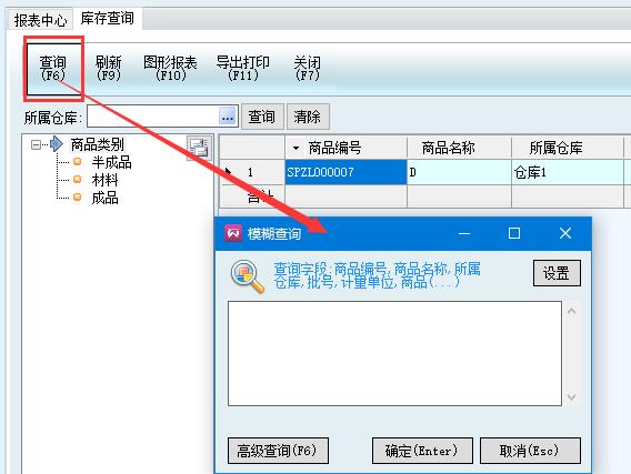 3)例如在庫存查詢,按鍵盤F6鍵,或者點(diǎn)擊菜單欄查詢按鈕,然后用掃描槍掃描產(chǎn)品的條碼,即可快速查詢到該產(chǎn)品