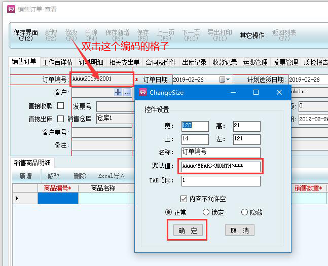 2、在彈出的窗口中,雙擊訂單編號的格子,彈出一個窗口,默認值改為你需要的編碼規則(例如這里AAAA****),修改好后點擊確定
