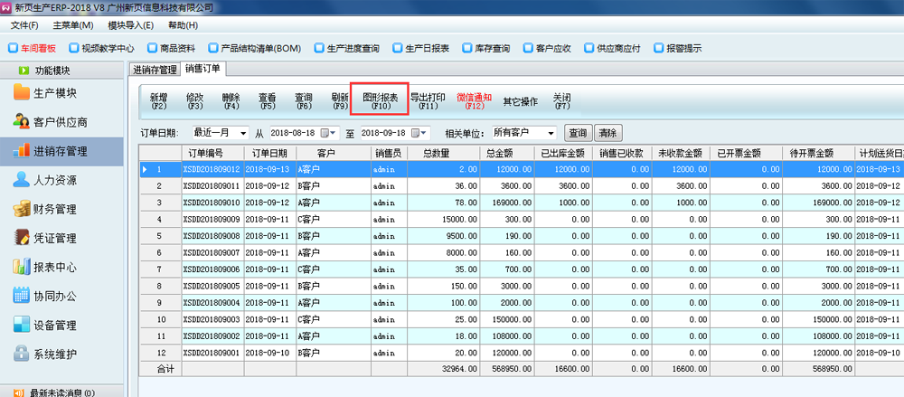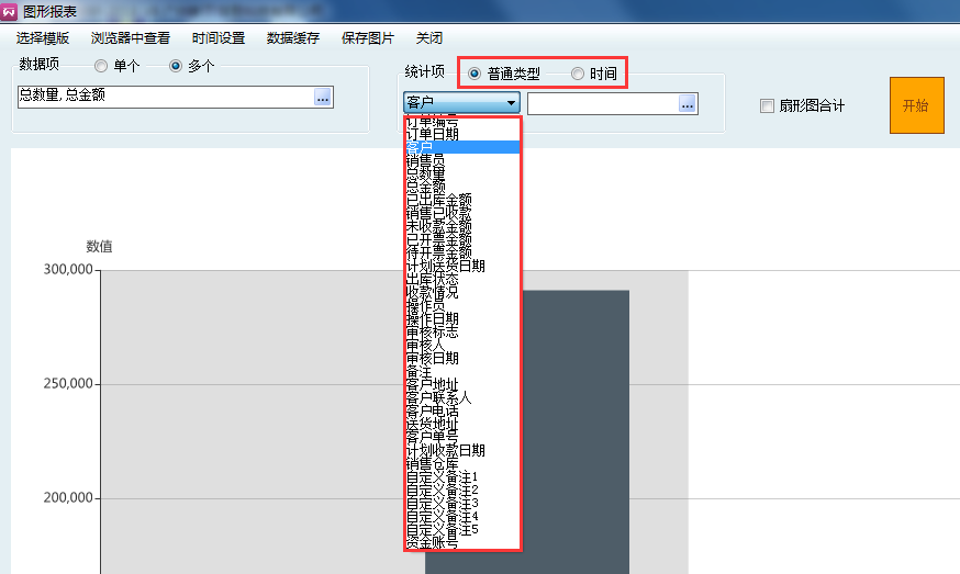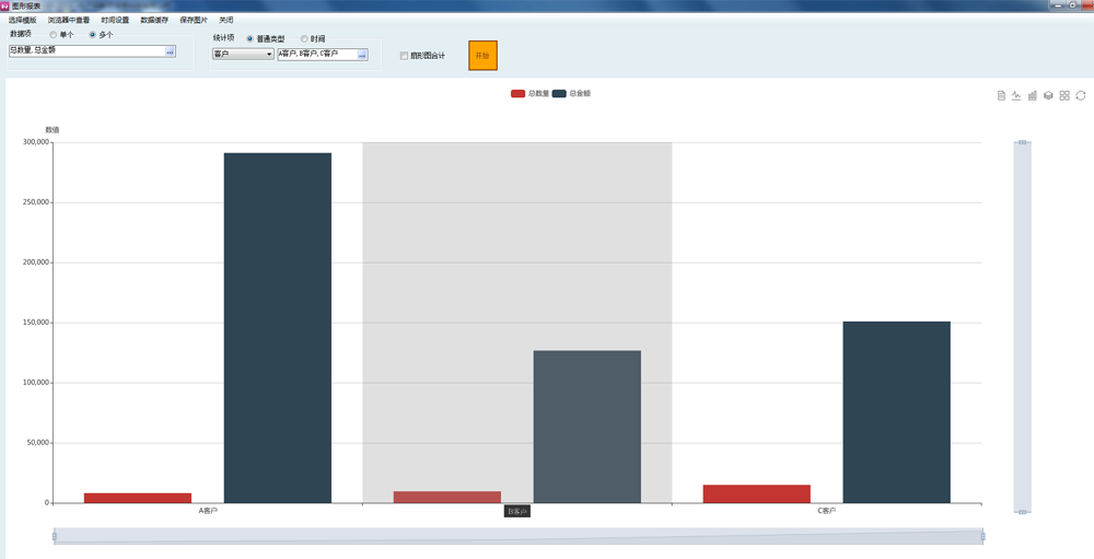 1、這里做分析客戶的總金額和總數(shù)量的圖形報表。在銷售訂單列表點擊圖形報表