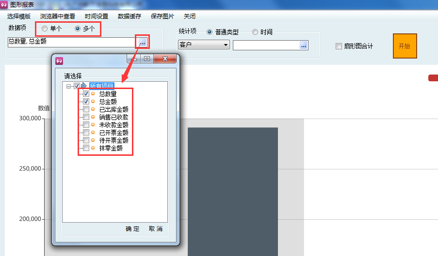 2、數(shù)據(jù)項可以選單個或者多個,這里想要分析總金額和總數(shù)量,所以選擇多個,然后點擊…這個符號,勾選你需要的選項,例如這里勾選總數(shù)量和總金額,點擊確定。