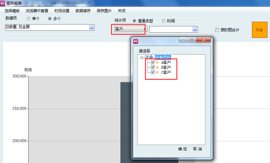 3、統(tǒng)計項,如果需要分析關于時間的,就勾選時間,這里選擇客戶,所以勾選普通類型,選擇客戶之后,勾選你需要分析的客戶,點擊確定。