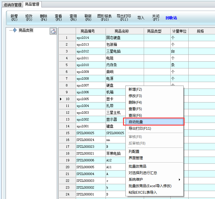 1、例如這里對商品資料進(jìn)行批量處理,在商品管理列表點擊鼠標(biāo)右鍵,選擇啟動批量