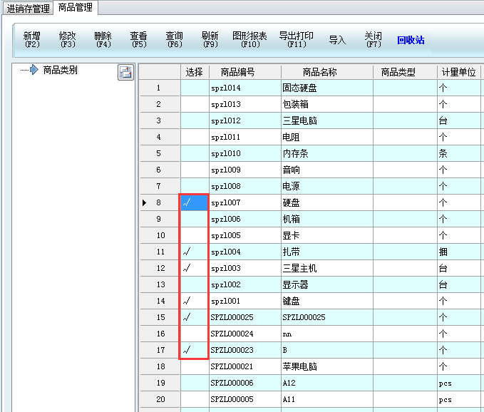 2、在每個商品前面都有一個空格,雙擊鼠標(biāo),勾選你需要批量處理的商品(如果需要全部選擇的,就再次點擊鼠標(biāo)右鍵,選擇全選),如下圖,選好之后,就可以進(jìn)行批量處理,例如,如果需要刪除選中的商品,則可以點擊菜單欄的刪除按鈕。