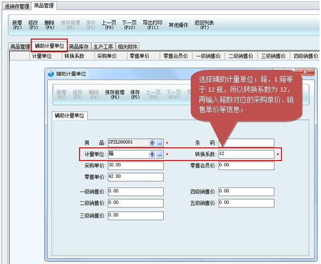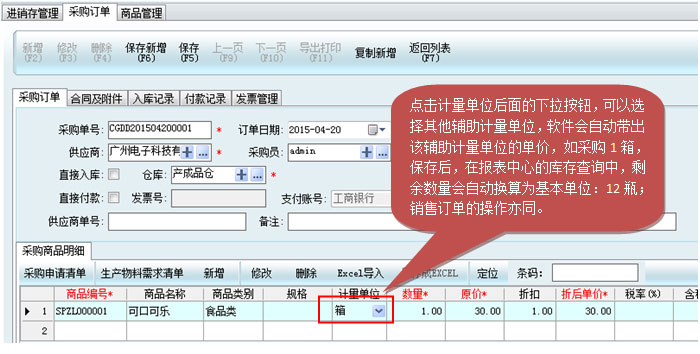 軟件中要注意,要以最小的單位為基本單位,大單位為輔助計量單位。如可口可樂,最小的單位是瓶,大單位可以是箱。