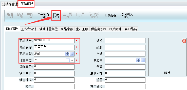 1、打開進銷存管理-商品管理,填寫好商品資料之后,點擊保存(一定要點擊保存,再往下操作)