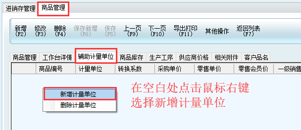 2、仍然在商品管理中,點擊菜單欄中的輔助計量單位,在空白處點擊鼠標右鍵,選擇新增計量單位;