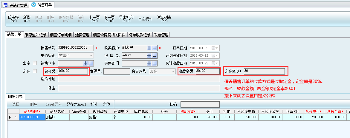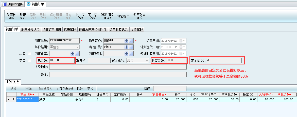 1、舉個例子,假設(shè)銷售訂單的收款方式是收取定金,定金率是30%,那么就要對“收款金額”這個數(shù)據(jù)設(shè)置計算公式,計算公式應為: