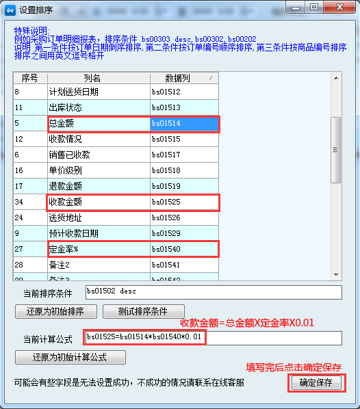 3、在當前計算公式的框中填寫公式:bs01525=bs01514*bs01540*0.01(對照數(shù)據(jù)列,意思即:收款金額=總金額X定金率X0.01),公式與公式之間用&隔開,填寫完后點擊確定保存。