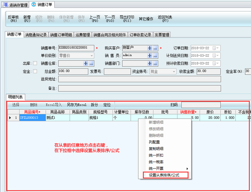2、主表添加計算公式需要在訂單列表界面任意地方點擊鼠標右鍵,選擇更多設(shè)置—設(shè)置主表排序。