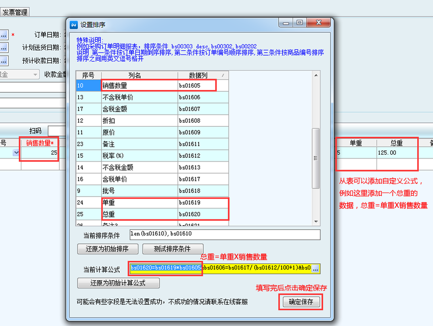 bs01620=bs01619*bs01605(即:總重=單重X銷售數(shù)量),公式與公式之間用&隔開,設(shè)置好后點擊確定保存。