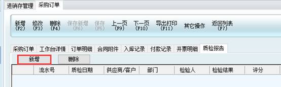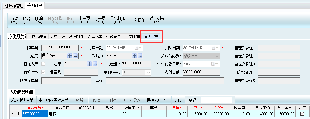 下面以采購訂單為例,保存采購訂單以后,要在質檢報告上做驗收。