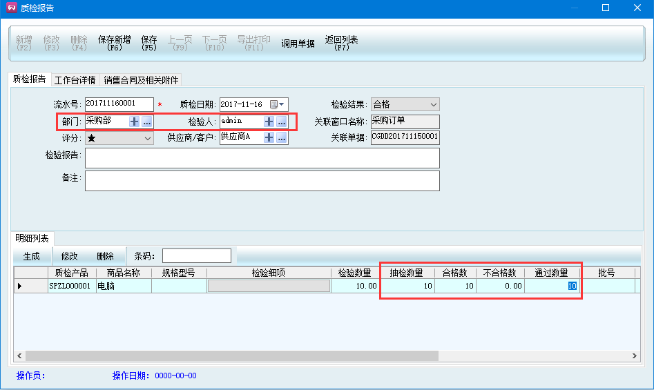 選擇質檢部門,檢驗人默認是操作人,自動帶出供應商名稱和關聯單據編號,