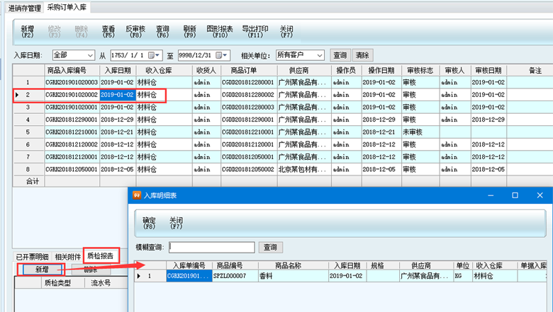 3、以采購入庫單為例,先選中需要添加質檢報告的采購入庫單,然后再下方點擊質檢報告,再點擊新增,在彈出的窗口中選擇要質檢的商品