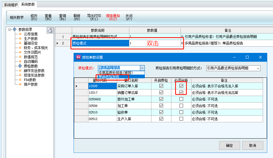 在系統維護——系統參數——質檢參數——采購訂單(銷售訂單)——開啟質檢(必須合格)