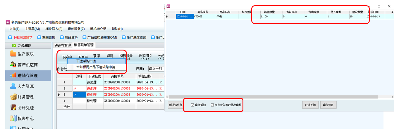 3,勾選庫存抵扣,考慮待入庫數待出庫數,則建議數量=銷售數量-當前庫存+待出庫數量-待入庫數