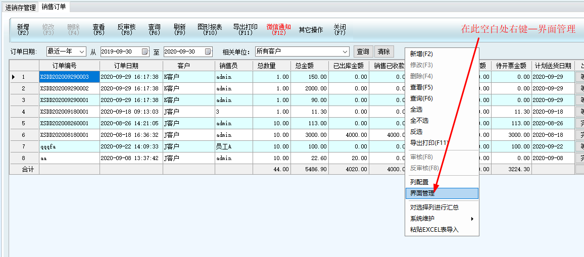 1.打開銷售訂單——在上方空白處右鍵——界面管理
