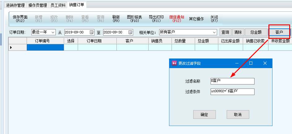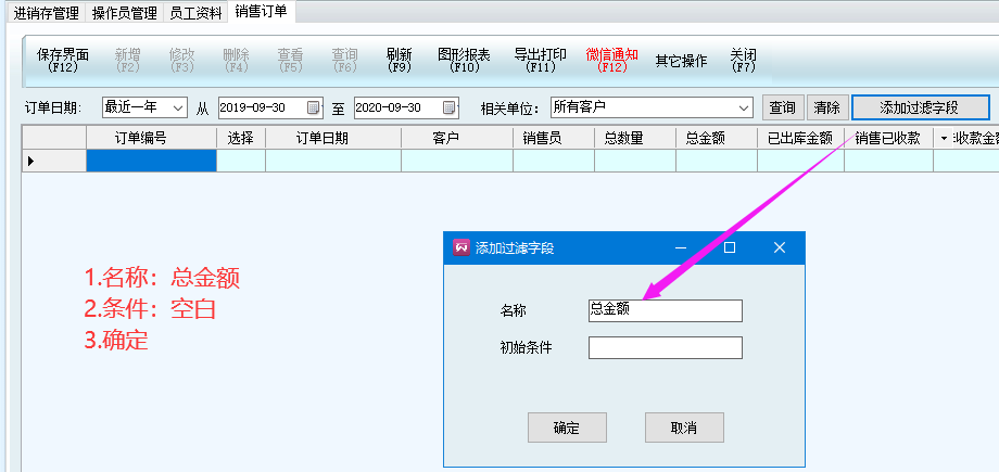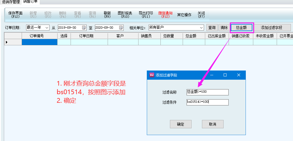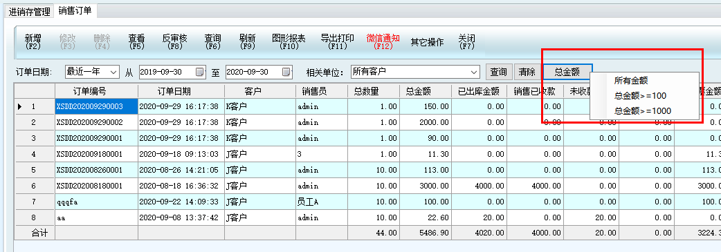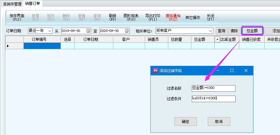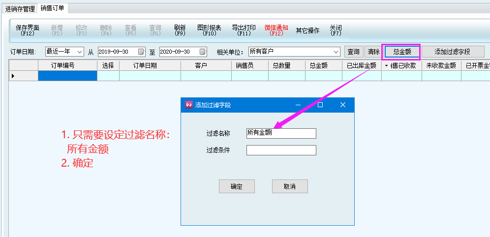 4.5 設置完成,保存界面,重新打開銷售訂單,點擊總金額,即可出來篩選條件。