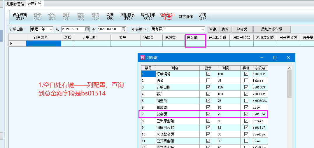 4.1先查詢知道總金額的字段:右鍵—列配置