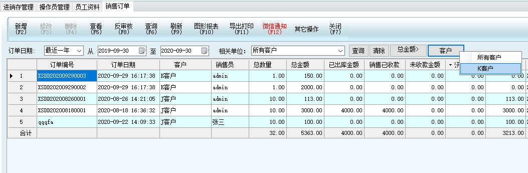 在銷售訂單界面,多字段聯合查詢,可以快速根據篩選條件查到相關單據。