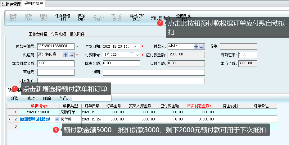 ①支付預付款:還沒下達采購訂單,先預付貨款給供應商,在