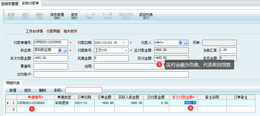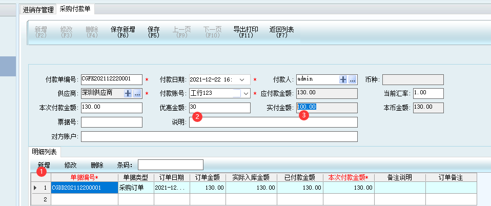 采購付款時填寫優惠金額,比如訂單貨款130,實付100元, 那么填寫優惠金額30