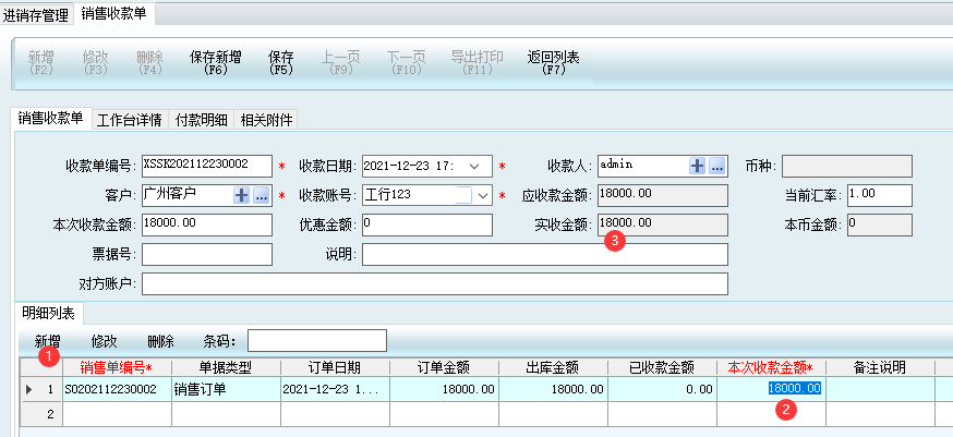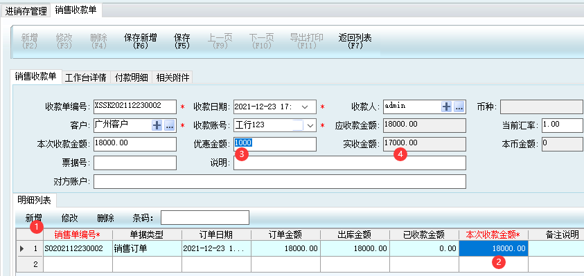 做銷售收款時填寫優惠金額,比如訂單貨款18000,實收17000,給客戶返利1000元