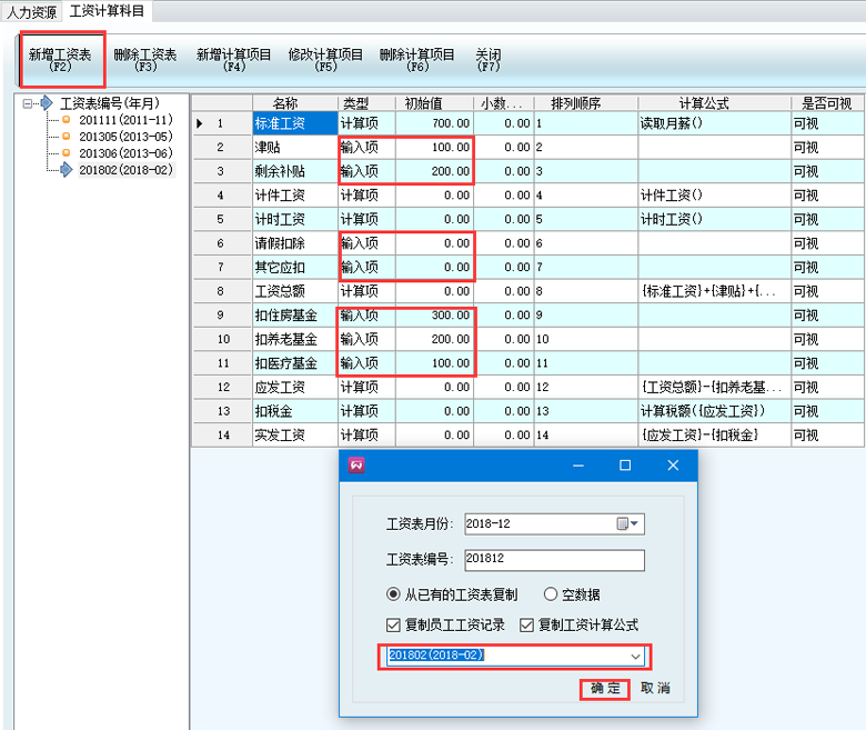 3、在人力資源-工資計算科目,如下圖,輸入項是可以根據企業自身的情況來手動輸入的。計算項是軟件默認的公式,也可自己修改公式。例如這里做2018年12的工資表,點擊菜單欄新增工資表,然后選擇月份,填寫工資表編號,如果勾選從已有的工資表復制,則需要選擇復制哪個月份的工資表,然后點擊確定。(每個月新增一次工資表)