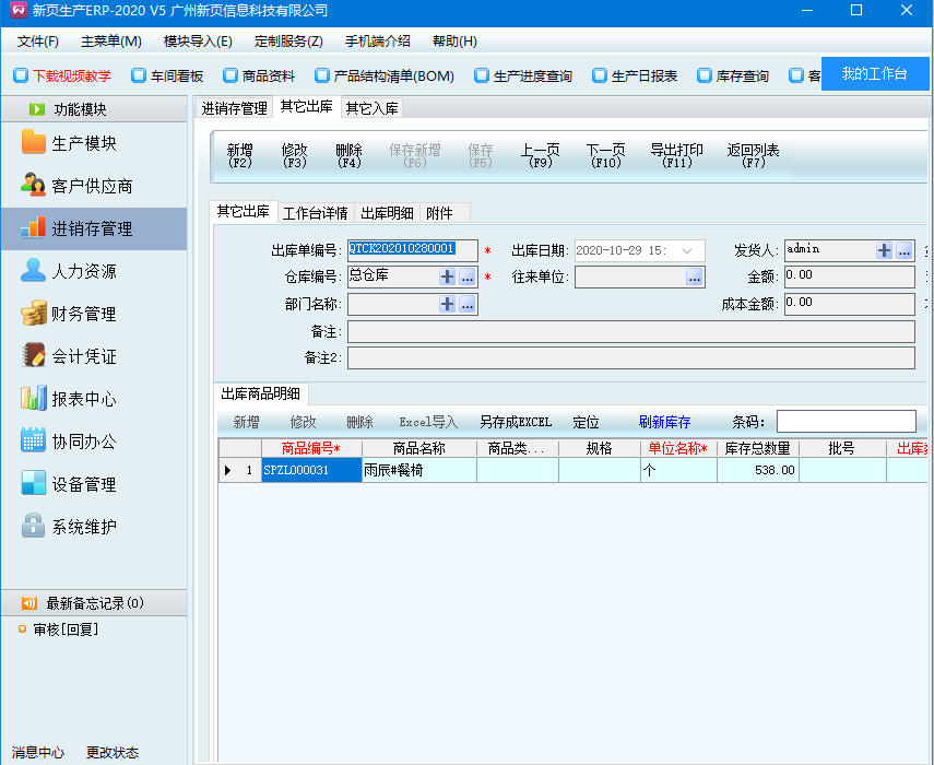 然后就會讀取到這個商品對應的信息,如編號、名稱、規格等等,收貨單位、發貨部門、發貨倉庫、發貨人等皆可通過手動選擇。