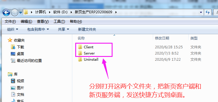 打開D盤的client和server文件夾,找到新頁客戶端和新頁服務端,右鍵——發送到——桌面快捷方式