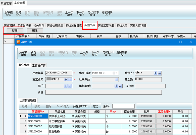 3、用戶可以用實驗出庫來登記實驗過程領取的工具和材料,也可以用實驗出庫來登記樣品送出去給客戶的記錄。點擊實驗出庫,然后點擊新增,然后選擇倉庫,選擇出庫的商品,然后保存。